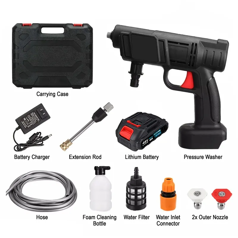 The Cordless Pressure Washer is a powerful and portable cleaning solution. With a 48V, 200W motor, it delivers a maximum pressure of 30 bar and a water flow rate of 3.5 L/min. Its spray can reach distances of 6-8 meters, making it ideal for various cleaning tasks. The washer is equipped with a battery capacity of 5 x 1200mAh cells, providing about 18 minutes of use per 4-hour charge. Made from durable ABS, PP, and alloy materials, it is designed for efficiency and convenience.