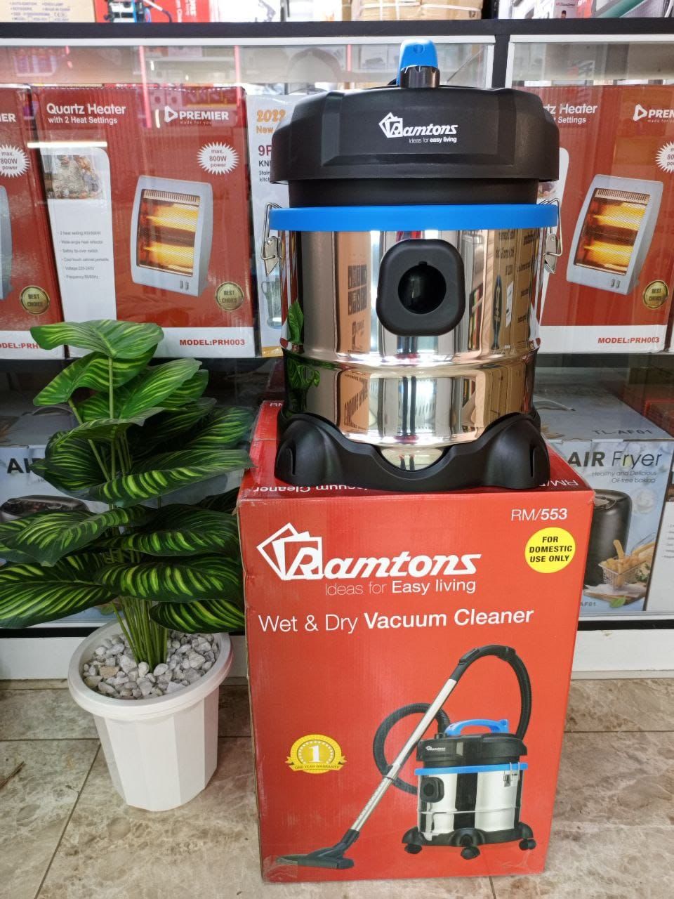 The Ramtons RM/553 Wet and Dry Vacuum Cleaner is a versatile and powerful cleaning solution for homes, offices, and workshops. Equipped with a 1400W motor, it delivers strong suction for both wet and dry cleaning. The 21L stainless steel tank ensures durability and large capacity, reducing the need for frequent emptying.